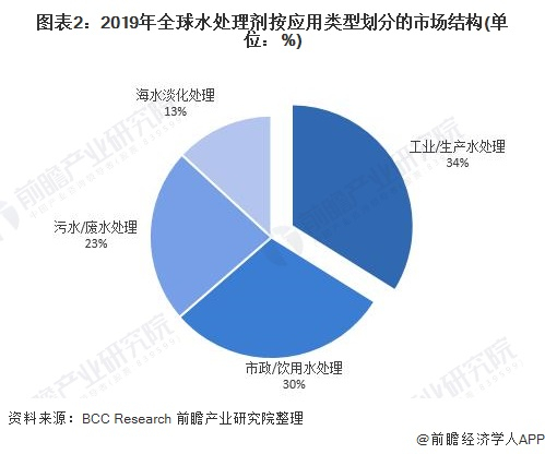 根据BCC Research数据统计,2019年全球水处理按应用类别划分的市场结构中,应用在工业生产水处理消耗的水处理剂最多,占到2019年全球水处理剂市场总额的34%;其次是市政及饮用水处理,这一领域的水处理剂市场规模占比为30%;然后在污水和废水处理板块,水处理剂市场规模为23%;最后在海水淡化领域,市场份额占比为13%。