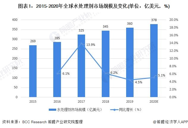 随着全球水资源短缺问题日益严重以及人们对环境的关注程度逐步提升,全球对水处理药剂需求持续增加。根据BCC Research数据,2015-2020年全球水处理剂市场规模整体呈现增长趋势,2019年全球水处理药剂市场总额约为360亿美元,预计2020年全球水处理剂的市场规模将达到约378亿美元。