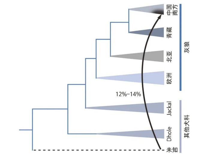 科学探究的过程总是充满着未知,但也经常会有意想不到的发现。虽然没有找到家犬的直接祖先,但我们发现中国南方的狼形成了一个单独类群,它是从西藏狼和中国北方狼中独立出来的。真正令人感到惊奇的是,虽然各种分析方法均表明浙江灰狼与南方灰狼聚为一枝,但浙江灰狼具有其它犬科动物12%—14%的基因组分,这种成分可能来源于中国南方和东南亚地区的豺,这暗示种间的基因交流可能对犬属动物的物种形成模式和种群结构塑造起到了关键作用[6]。