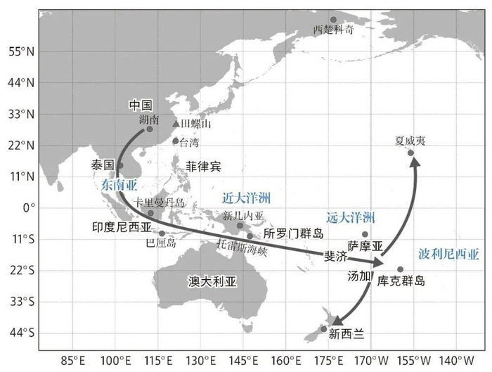 可以肯定的是,在征服大洋的过程中,他们并非孤军奋战,至少还携带着已经驯化的动物,包括家犬、家猪和家鸡等[1],这些动物不仅是艰难旅途中的伙伴,更是定居岛屿后的重要生产资料和食物来源。研究这些家养动物的来源与扩散情况,同样可以为人群的起源与扩散提供重要线索和参考,为研究人类文明演进提供另一视角。