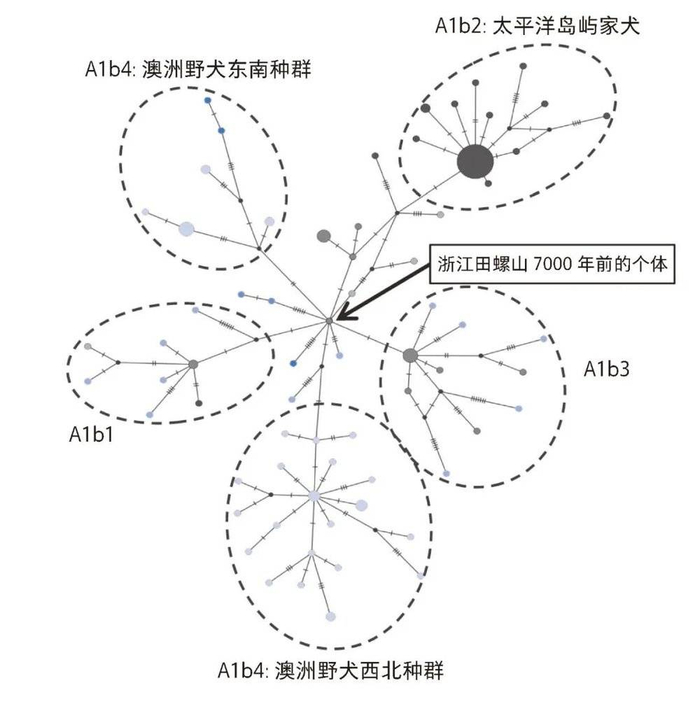 世界上75%现生家犬有的线粒体基因组属于类群A。亚洲是这种类群最丰富的地区,包含全部的6种亚类群。来自于长江黄河流域的古代家犬绝大多数(96%)属于类群A,这种比例与现生的泰国家犬(100%)、澳洲野犬(100%)及欧洲殖民者到来之前的古代太平洋岛屿家犬(100%,后面简称太平洋岛屿家犬)相似,这提示我们,中国古代家犬可能与这些地区的犬类在历史上有某种联系。通过对这一类群个体进行更细致的研究,发现中国古代材料中的大多数属于亚类群A1b(69.2%),同时也发现澳洲野犬(100%属于A1b4)和太平洋岛屿家犬(95%属于A1b2)具有极高的A1b类群比例,这使我们相信它们之间确实存在着历史联系。基于线粒体基因组序列构建的邻接法网络关系图的研究发现,浙江田螺山的个体(距今约7000年)处于选取的117个亚洲和大洋洲亚类群为A1b个体的中间位置,可能代表它来自于A1b类群的祖先群体。基于这些明显的证据,我们开始专门研究太平洋岛屿家犬与澳洲野犬是否真的来自于长江黄河流域的古代家犬,以及它们是如何扩散的。