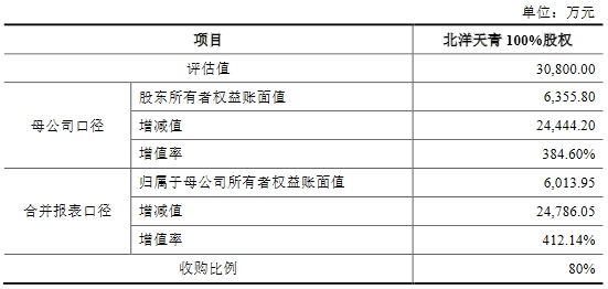 根据中同华出具并经京城机电审核备案的《资产评估报告》(中同华评报字[2020]第051655号),以2020年6月30日为评估基准日,北洋天青100%股权评估值为3.08亿元。其中母公司口径的股东所有者权益账面值为6355.80万元,增值2.44亿元,增值率为384.60%;合并报表口径的归属于母公司所有者权益账面值为6013.95万元,增值2.48亿元,增值率为412.14%。