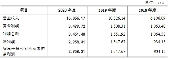 2018年至2020年,北洋天青实现营业收入分别为6106.09万元、1.03亿元、1.51亿元,实现归属于母公司所有者净利润分别为934.15万元、1347.67万元、2958.31万元,经营活动产生的现金流量净额分别为1595.26万元、-702.30万元、4059.30万元。