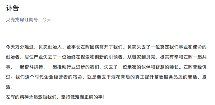 “贝壳失去了一位奠定我们事业和使命的创始者......”