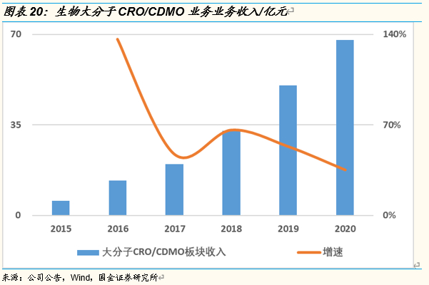 分版块4,生物大分子CRO/CDMO业务保持高速增长,未来高增长可期:2015-2020年上述29家公司中的大分子CRO/CDMO相关业务整体收入规模分别为6/13/20/33/50/68亿元,2016-2020年分别同比增长136%/47% /66% /53%/35%,2020年及之前,生物大分子CRO/CDMO板块绝大部分收入来自于临床前及临床阶段项目(2020年只有药明生物有2个商业化项目),2020年受到新冠疫情的影响,海外客户的大分子临床项目进度有所延迟,生物大分子CRO/CDMO板块收入增速受到一定影响。考虑到生物大分子领域的市场增速较快,目前国内CDMO企业的所服务的项目大多处在早期临床阶段,未来随着客户项目的不断推进,会逐渐出现大体量的商业化CMO订单,参考小分子CDMO的商业模式(商业化项目占比60%左右,公司业绩仍能保持20-30%增长),生物大分子CRO/CDMO业务领域的成长空间和成长性巨大。