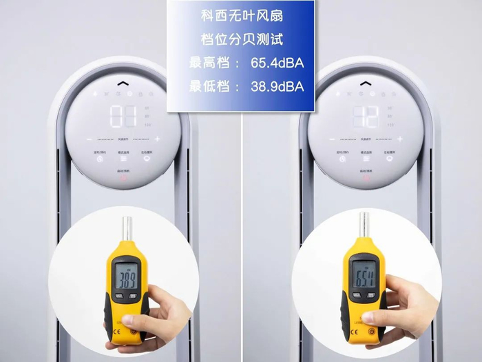 开启科西无叶风扇的最低档和最高档后,环境的整体噪音分别是38.9dB和65.4dB。