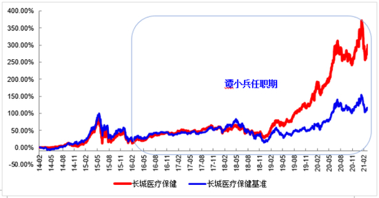 注:1、长城医疗保健基金成立于2014年2月28日,谭小兵自2016年2月3日接管。该基金自成立以来的年度业绩及业绩比较基准如下:2016、2017、2018、2019、2020年的业绩/业绩基准涨幅分别为-3.09%/-10.54%、9.98%/12.40%、-14.65%/-22.86%、71.15%/27.54%、73.98%/45.72%。