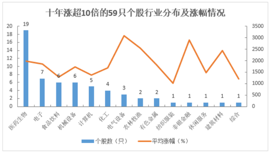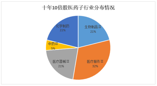 若以彼得·林奇的“十倍股”概念来衡量医药行业的表现,近10年涨幅超过10倍的59只个股有32%出自医药行业,平均涨幅则接近20倍;而假如将考察的范围扩大至“五倍股”(即涨幅超500%的股票),185只上涨超5倍的个股中,有37只为医药股,平均涨幅约1350%(数据来源:Wind,数据区间为2011/4/1-2021/3/31),同时医药行业细分领域覆盖广泛,包括医疗服务、生物制品、化学制药、医疗器械等子行业遍布着众多“十倍股”。