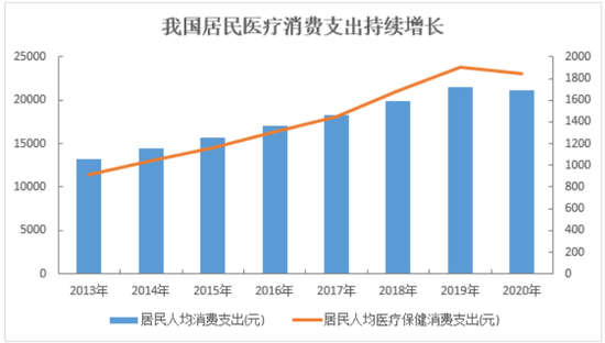 人口老龄化程度加重带来了医疗消费支出的快速增长。2013-2020年期间,中国人均消费支出增长60%,其中人均医疗保健消费支出增长102%(数据来源:国家统计局,数据区间为2013/1/1-2020/12/31)。医疗消费作为刚需,未来将有望加快增长的步伐。