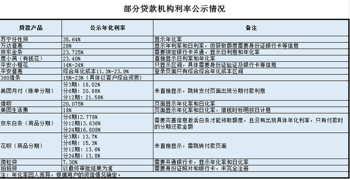 值得注意的是,部分网贷产品在官方渠道公示过年化利率,但在具体消费场景中,这些产品的年化利率又不约而同地“躲猫猫”。