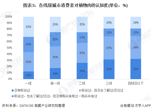 根据DATA100在2020年初的调研数据显示,我国消费者对植物肉的认知度较高,主要在60-80%之间,而一线和新一线城市的消费者对植物肉的认知度显著高于二线及以下城市。