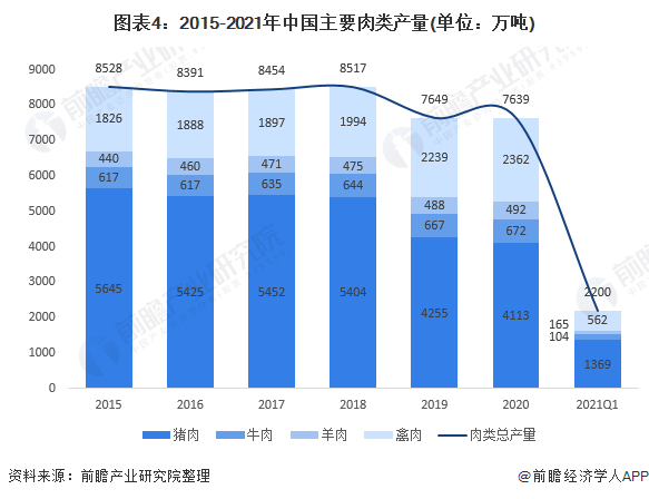 畜牧养殖容易遭受各种疫情的影响,导致产量大幅度波动,从而影响和供应及价格。2019年,受非洲猪瘟、环保政策等多因素影响,我国猪肉产量大肚下降,虽然牛肉、羊肉、禽肉产量仍保持增长趋势,但由于体量较少,我国肉类总产量仍明显下降。2020年,我国肉类总产量达7639万吨。