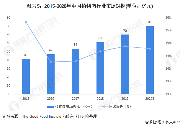 近年来,中国植物肉产业的增长率在过去五年中一直稳定在13.5%至15.5%,远高于GDP增长率。The Good Food Institute数据显示,2019年,中国植物肉产业的市场规模约为70亿元,过去五年的年复合增长率在14%左右,保持快速增长。