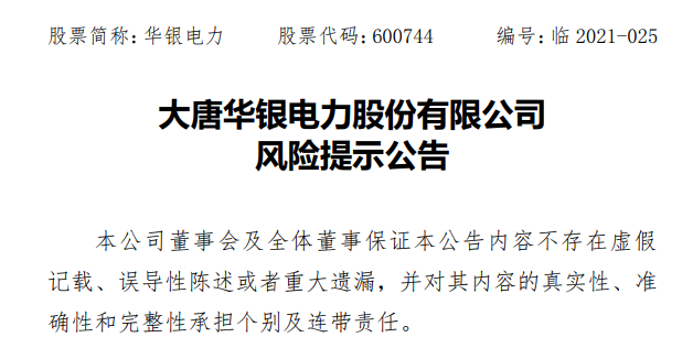 此外,在收获4天3连板后,昨日晚间,华银电力发布风险提示公告,公司股票价格于2021年5月18日至2021年5月20日连续三个交易日涨停,收盘价格涨幅偏离值累计超过20%,股票交易价格存在较大波动。不过,这似乎也没能阻挡该股在今天继续收获一个涨停……