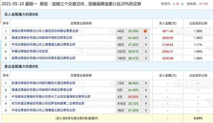 据上海证券报,5月10日,华泰证券公司总部、招商证券深南东路等营业部出现在当日龙虎榜席位中,连续3个交易日合计买入6096.95万元。