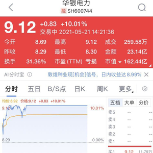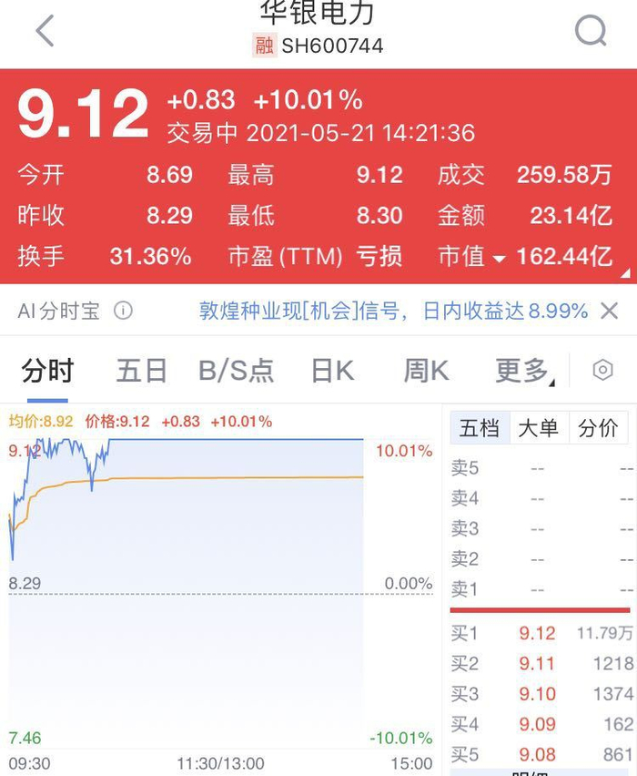 连续4个交易日涨停,近10万股民奔涌而来……今日,华银电力震荡走高,10时30分左右封住涨停板!自4月30日触及低点后一路反弹,股价突破了3月份创下的前期高点。该股5月以来涨幅已经超过90%。截至收盘,华银电力涨10.01%,报价9.12元,市值162.44亿元。
