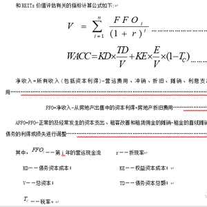 l从REITs的价值评估研究历史来看,国外经历了一段较长的探索期。作为一种权益型投资产品,REITs有着与其它公开市场交易的股票类似的估值方法。但是,REITs也有其特殊的属性。一方面,REITs实质上是一篮子物业组合的投资主体,在美国REITs要求其资产至少要将75%投资于不动产,收入中至少有75%应来源于不动产的相关收入;应税投资收益扣除资本利得与确定的非现金可纳税收益之外,以股利方式分配给投资者的比例不得低于90%。从这个意义上讲REITs股票的价格应当反映REITs所持房地产的现值;另一方面,REITs通过管理人的主动管理,能够实现积极的资本扩张和价值提升,与证券市场上的其他经营性公司也有相似之处,应当根据其自身的潜在盈利能力估值。因此,在对REITs进行估值时,REITs的投资人和研究人员倾向于将具有高度流动性的权益类证券的估值方法和房地产估值方法结合在一起使用,以估算出REITs的基本价值。
