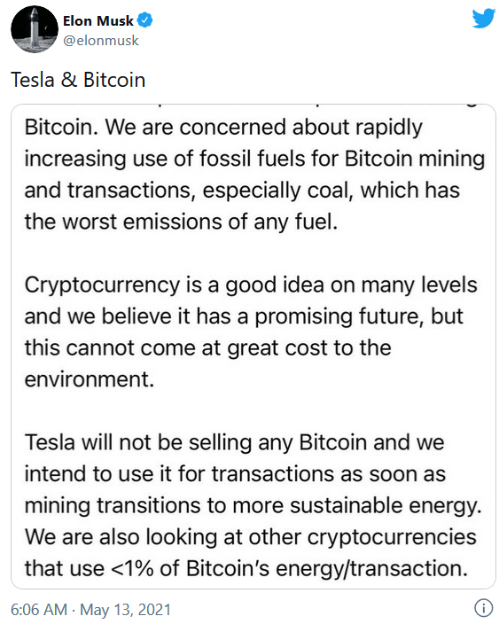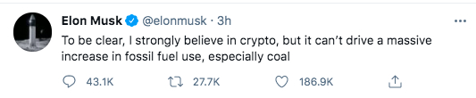 当时,马斯克突然在社交媒体宣布:“特斯拉已经叫停用比特币购车。我们担心比特币挖矿和交易导致化石燃料、尤其是煤炭的耗用飞速增长,煤炭是所有化石燃料排放中影响最恶劣的。”