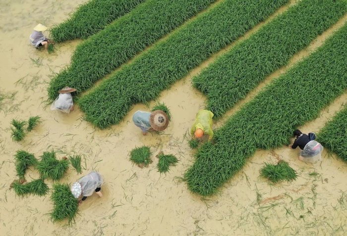 2020年5月20日,在贵州省铜仁市玉屏侗族自治县新店镇沙水坪村,村民在秧苗田里劳作(无人机照片)。当日是二十四节气中的小满。新华社发(胡攀学摄)