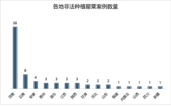涉及非法种植的案例中,河南省数量最多,有36个,其中该省下辖的唐河县有14个。