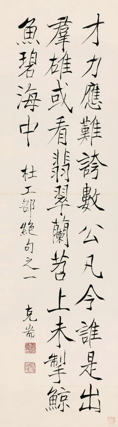 具体而言,其楷书根植褚遂良,写得灵动潇洒,绰约婀娜,瘦硬朗健,绵里藏劲,线条充满力量感和律动感,丝毫不具板滞僵化之态,被启功誉为“当代褚书第一人”;草书则取法怀素,写得行云流水,恣肆酣畅,纵逸多变,气势雄健,极富视觉冲击力,在20世纪30、40年代曾名震一时,被章士钊、沈尹默、乔大壮等称为草圣,乔大壮还专门为其刻有一方“克耑草圣”之印。“晚清第一词人”赵熙也对其草书给予了高度评价和期许:“君于藏真,已得其纵,如得其敛,则五百年一人矣。”