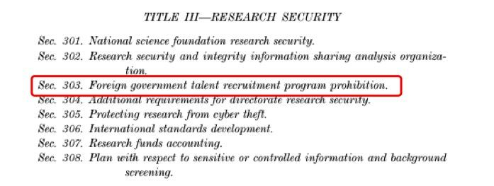 《无尽前沿法案》的第303条,格外引人注目——禁止联邦科学机构的所有成员加入外国政府人才招聘项目。