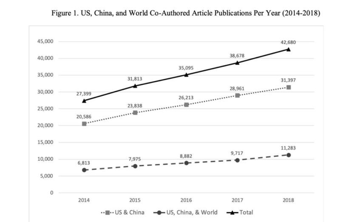 ▲美国、中国和世界其他国家合作论文数量(2014年-2018年)均呈现上升趋势
