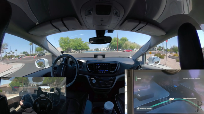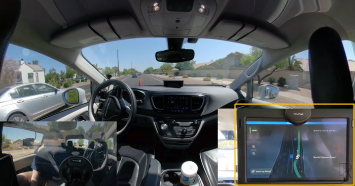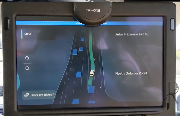 这时还发生了一个小插曲,在后方平板屏幕上,系统给出了“预计到达时间不到1分钟”的提示。但根据Ricks手机给出的信息,距离目的地还有12分钟车程。