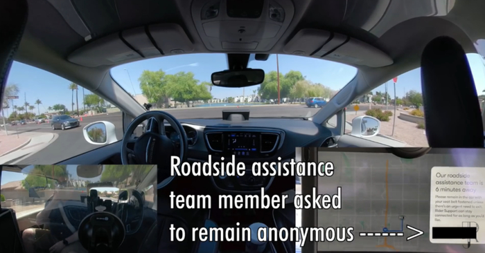 这时,道路救援小组(roadside assistance team)通过车内的通讯设备联系到了Ricks。工作人员表示,相关驾驶员会尽快赶来,并通过人工驾驶将他送往目的地。