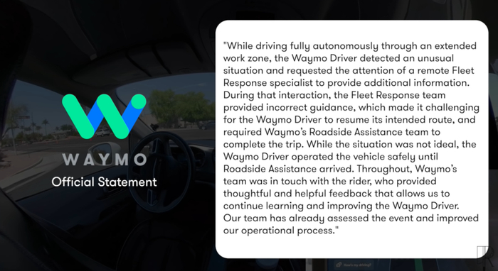 对于此次种种突发事故,Waymo官方也给出了回复,称这次的出行确实“不能令人满意”。