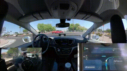 可以看到,现在Waymo停在一个T字路口,根据后方平板显示,汽车的预计通行路线仍然是右转进入车道,但此时该最右侧的车道已经被封锁了。