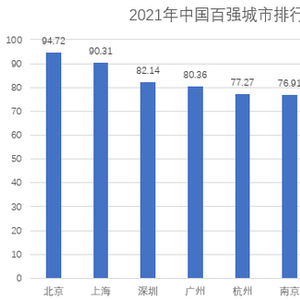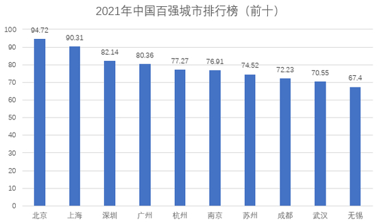其中,北京、上海高居前两位,综合分值分别为94.72和90.31。位居第三至第十位的依次是深圳(82.14)、广州(80.36)、杭州(77.27)、南京(76.91)、苏州(74.52)、成都(72.23)、武汉(70.55)和无锡(67.40)。