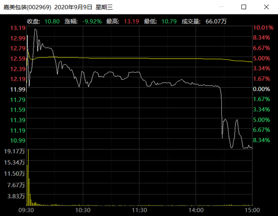 当日嘉美包装股票价格剧烈震荡,振幅高达20.02%,换手率达69.36%。此后,该股票连续三日跌停,距2020年9月9日股价最高点一度大跌达58.75%,投资者损失巨大。