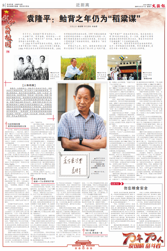 2019年8月9日,袁隆平90岁农历生日。文汇报近距离版面曾于2019年8月7日刊发“70年70人”人物特稿《袁隆平:鲐背之年仍为“稻粱谋”》,现重发此文,缅怀袁老!