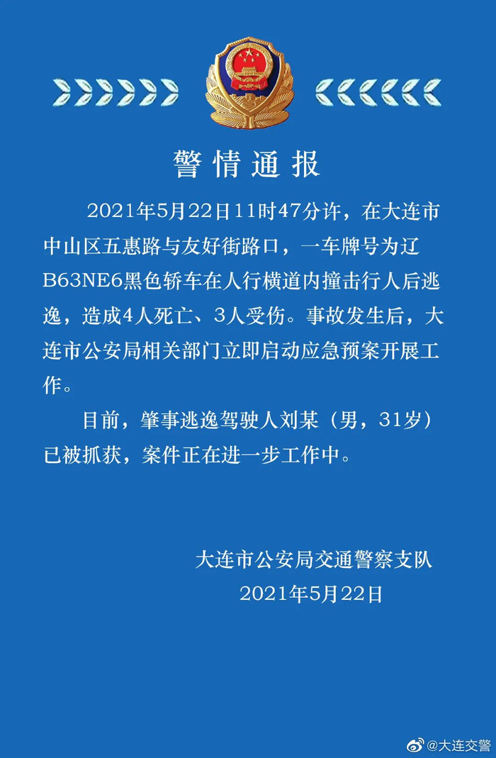 @大连交警5月22日消息,2021年5月22日11时47分许,在大连市中山区五惠路与友好街路口,一车牌号为辽B63NE6黑色轿车在人行横道内撞击行人后逃逸,造成4人死亡、3人受伤。事故发生后,大连市公安局相关部门立即启动应急预案开展工作。目前,肇事逃逸驾驶人刘某(男,31岁)已被抓获,案件正在进一步工作中。