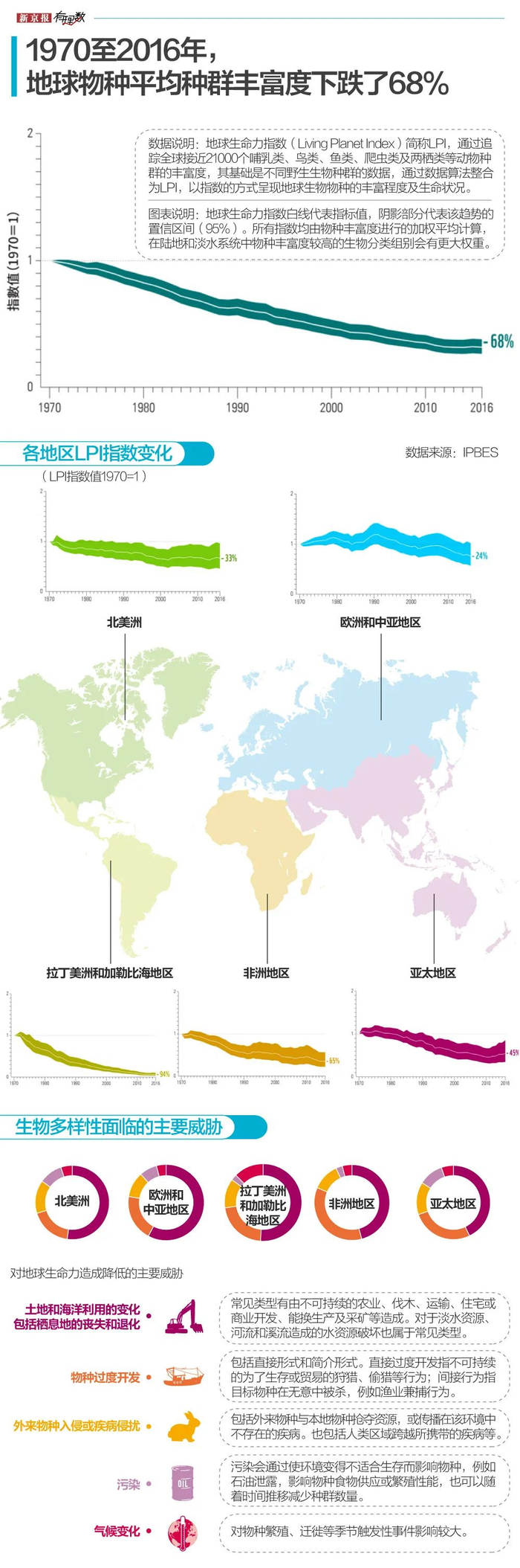 在全球范围内,拥有全球最大热带森林的拉丁美洲生物多样性丧失最为明显,40年间物种丰富度下降94%,是全球最严重地区。而土地和海洋利用的变化,包括栖息地的丧失和退化是生物多样性面临的最大的威胁。