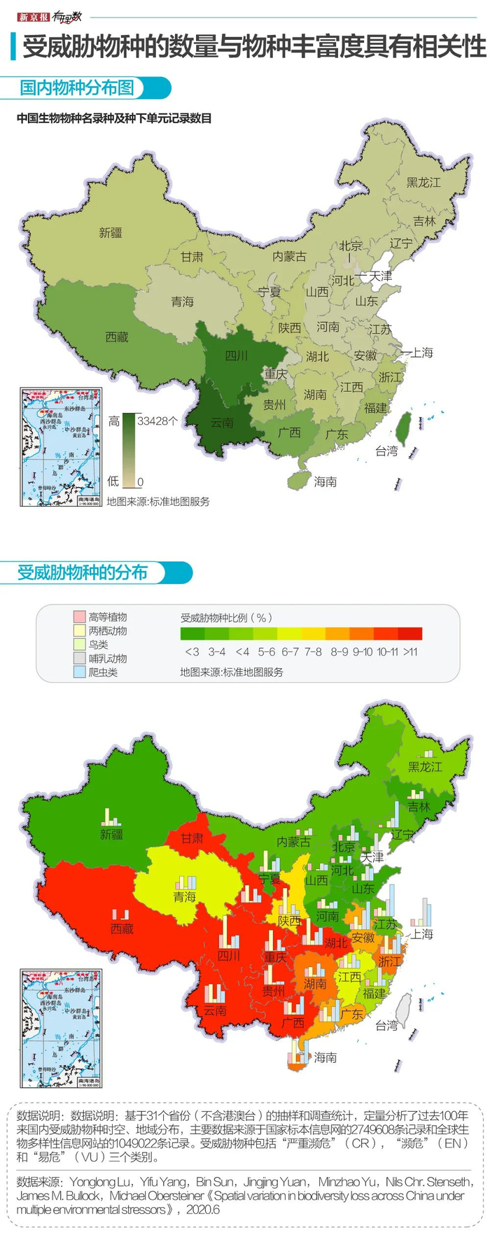 2020年6月,由厦门大学环境与生态学院、中科院生态环境研究中心等机构研究发布的一篇关于我国生物多样性生存空间变化的论文显示,我国濒危物种主要分布在西南和华南地区,包括云南、四川、广西等地,而中部和东北部的受威胁物种数量相对较少。
