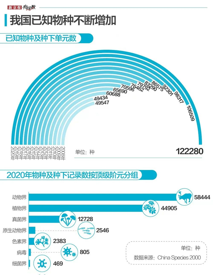在中科院生物多样性委员会发布的《中国生物物种名录2020版》里,我国生物物种已经达到122280种,包括58444个动物物种,44905个植物物种,12728个真菌物种以及细菌、病毒等物种。