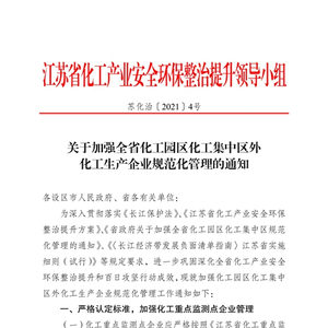 5月18日,江苏省化工产业安全环保整治提升领导小组办公室(江苏省化治办)印发苏化治〔2021〕4号文件——《关于加强全省化工园区化工集中区外化工生产企业规范化管理的通知》,这是该省首次针对园区外企业正式提出指导方案。