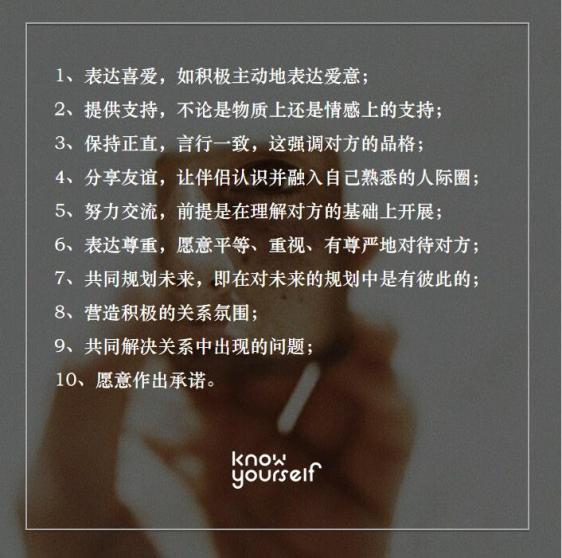 行为信号:Weigel在2002年的研究中,提出了10个与关系承诺度和满意度相关的主要指标。在这几个方面满足越多的伴侣,越可能是对的人。