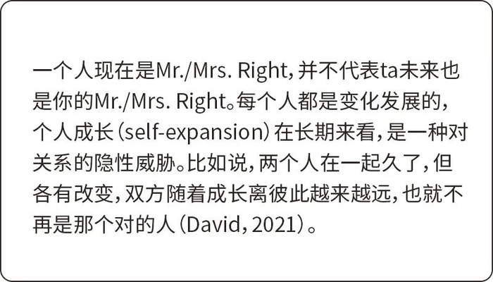 在亲密关系中,人们需要培养对彼此真诚的兴趣(genuine interest),它指的是两个人都具有对伴侣内在世界的好奇心,即便生活一成不变,具有真诚兴趣的伴侣,也会好奇对方今天经历了什么、心情怎么样,等等。不仅可以为关系注入新鲜感,还能让我们不断深入地了解对方,把握住对的人,维系这段对的关系。