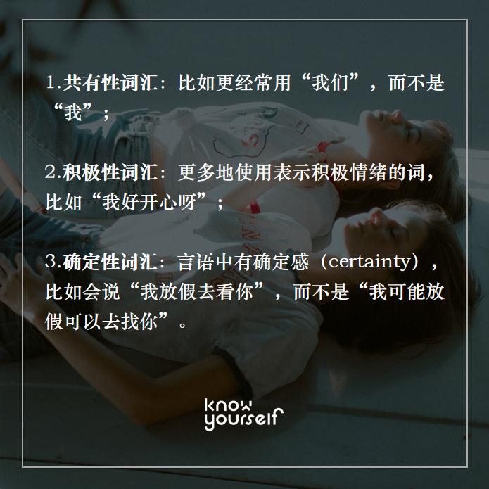 反过来,一个对自我认知更加积极、稳定的人,也就是自尊水平较高的人,也更容易去发展一段平等、健康的亲密关系。这也是为什么低自尊者有时会反复陷入和“不对的人”的关系中。