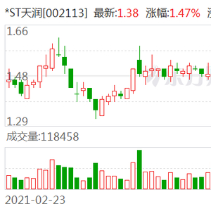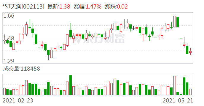 今年5月21日,ST天润报收1.38元,涨1.47%,换手率1.23%,总市值20.85亿元。