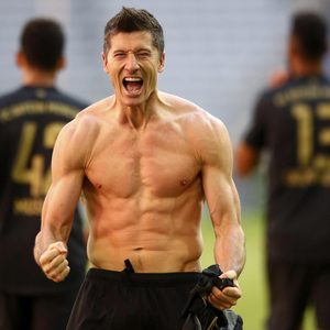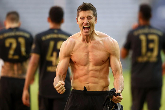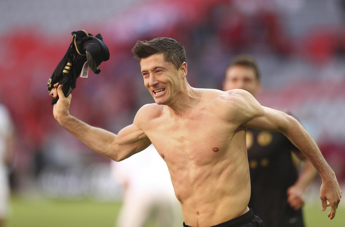 莱万脱衣庆祝。