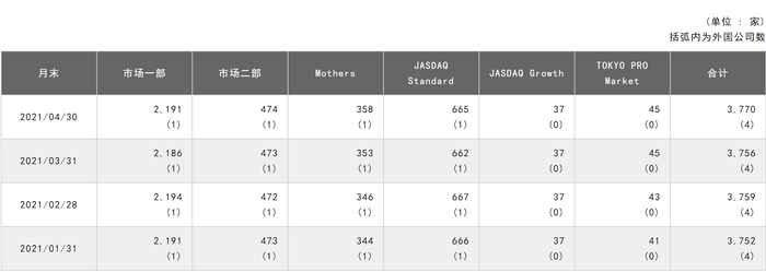 截至2021年4月30日,东交所共计上市公司3770家,市场一部上市2191家,市场二部上市474家,Mothers上市358家,JASDAQ标准版上市665家,JASDAQ成长版37家。