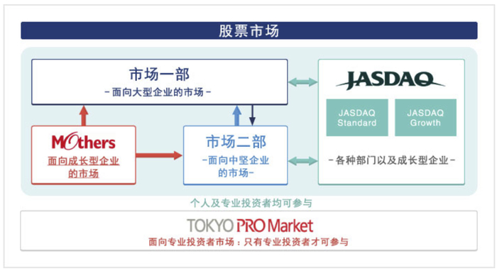 东交所运营着几大市场,个人及专业投资者均可参与市场一部和市场二部、Mothers,以及JASDAQ四个市场的投资,另有面向专业投资者的TOKYO PRO Market。