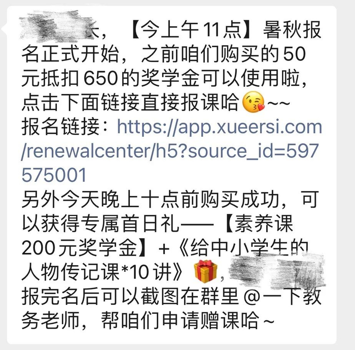 但上述家长并不认同这一道理。“‘暑秋联报’本身是周期行为,为什么要按课时计算?如果这一暑秋课程合规,为何机构APP显示不了报名页面,只能偷偷通过销售老师发送的链接,才能点击。为何提前收取“膨胀金”?为何早于近两个月之前就拼命鼓动家长缴费,设定缴费截止日期?