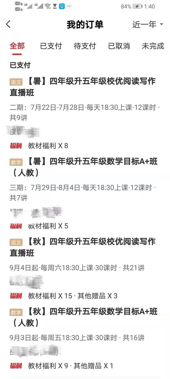 根据上述家长提供的缴费页面显示,学而思网校语文(暑期)四年级升五年级校优阅读写作直播班12课时共九讲(7月22日-7月28日每天18:30分上课),加上(秋季)四年级升五年级校优阅读写作直播班30课时21讲(9月4日起,每周六18:30分上课),时长已超过3个月。另,在其所报的四年级升五年级数学目标A+班等课程中也存在上述情况。