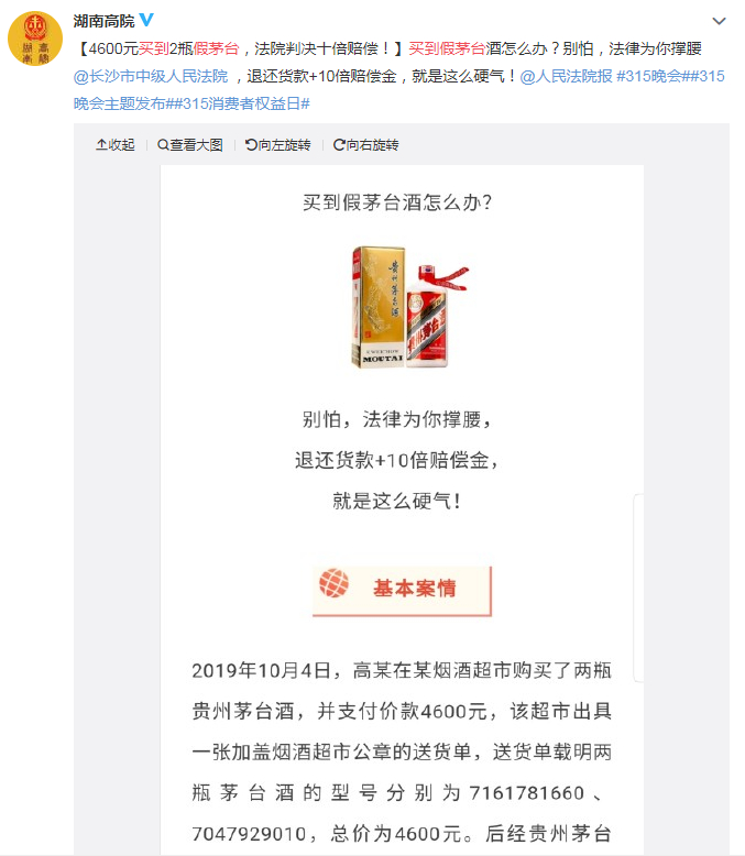 湖南高院还表示:“买到假茅台酒怎么办?别怕,法律为你撑腰,退还货款+10倍赔偿金,就是这么硬气!”