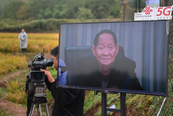 2020年11月2日,袁隆平院士在位于长沙的湖南杂交水稻研究中心与测产现场进行视频连线。新华社记者 陈泽国 摄